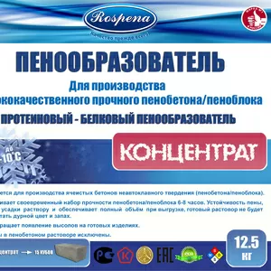 Новый Российский первоклассный белковый пенообразователь Rospena, созданный по европейской технологии схожим по качеству с импортными пенообразователями белковыми для пенобетона, пеноблока, белковый - протеиновый, пенообразователь для пенобетона Rospena. Прекрасно подходит для создания на любых установках с пеногенератором или поризатором, даже при производстве сверхлегких плотностей от D100! Высокая стабильность в цементном тесте при перемесе с цементом! Экономия цемента в два раза при соблюдении технологического процесса.