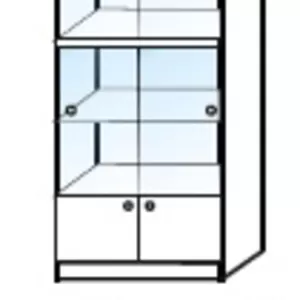 Витрина №1, пристенная со стеклянными дверками. Габаритные размеры: 2100х300х900. Материал: ЛДСП, стекло. Количество полок: 3..