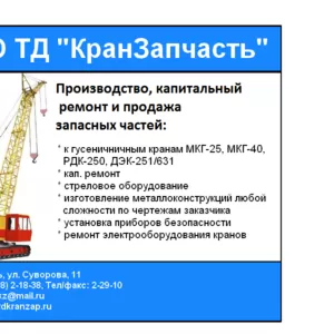 Продам гусеничные краны после капитального ремонта Изготовление запасных частей ко всем кранам марки МКГ-16, МКГ-25, МКГ-40, ремонт РДК, запчасти ДЭК, СКГ; Изготовление металлоконструкций любой сложности по чертежам заказчика; Изготовление стрелового оборудования на краны и его ремонт; Производство капитально- восстановительного ремонта и реконструкции кранов типа МКГ, РДК, ДЭК; Установка приборов безопасности; Ремонт электрооборудования кранов.